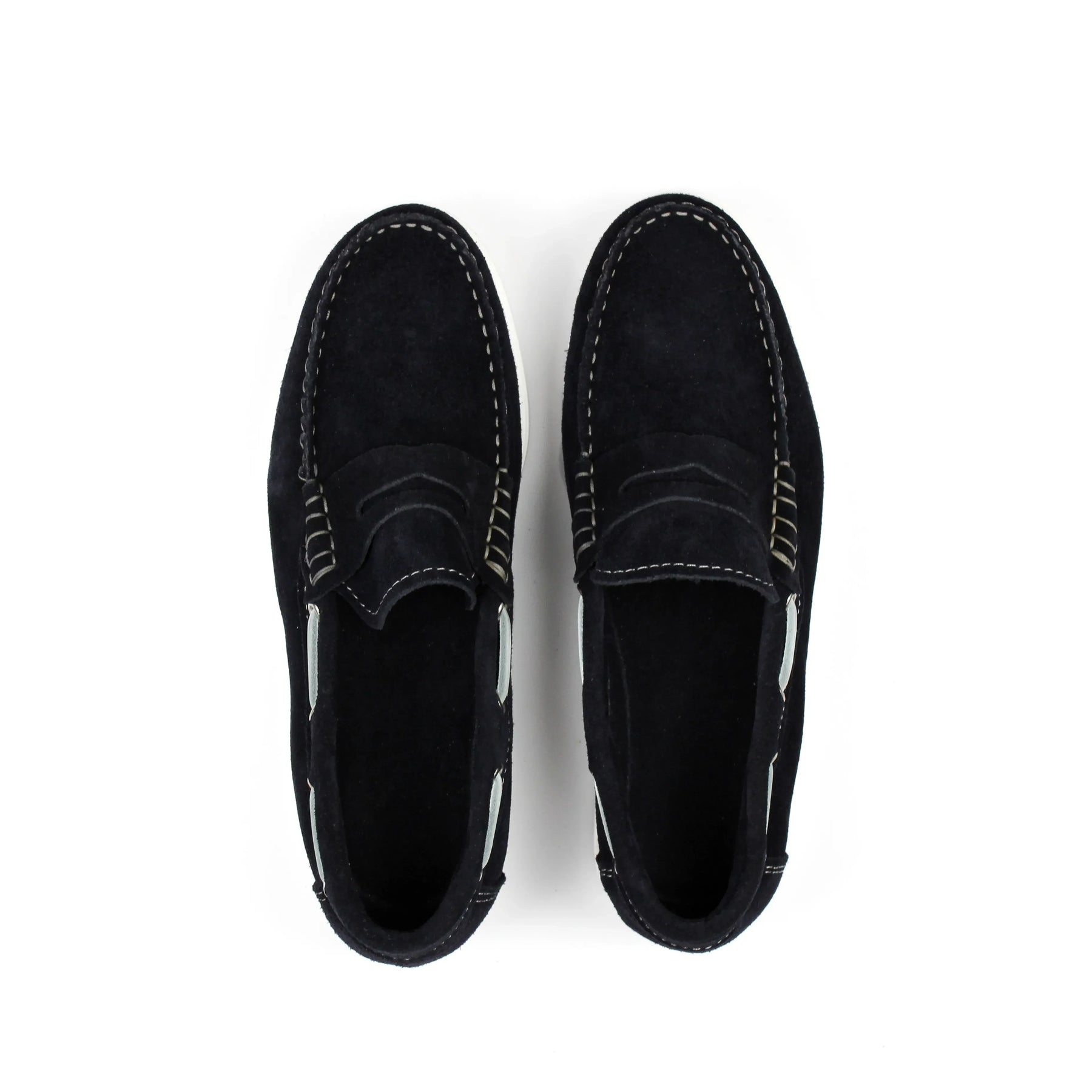 I Mocassini Barca in Vero Camoscio Blu combinano il fascino della tradizione nautica con l'eccellenza dell'artigianato italiano. Realizzati a mano dai nostri esperti artigiani, presentano una tomaia in camoscio blu e lacci in Vera Pelle Bianca.
